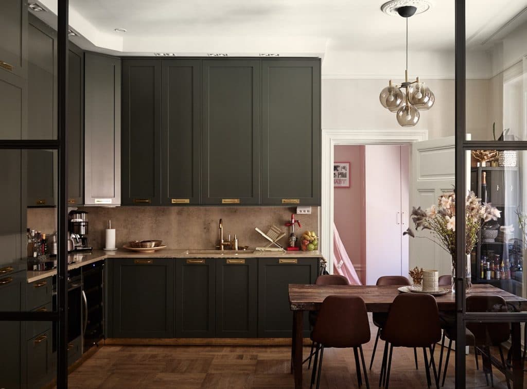 Detta eleganta mörkgröna kök har gått hela väggen utan kompromisser. Luckorna är inramade i shakerstil med Picky Livings distanslister. Väggskåpens luckor sträcker sig upp till tak för att maximera förvaringsutrymmet. Mässingsdetaljerna går som en röd tråd från lampa till kundens egna mässingssockel. Vi älskar att köket får ta en så färgstark plats i detta hem!