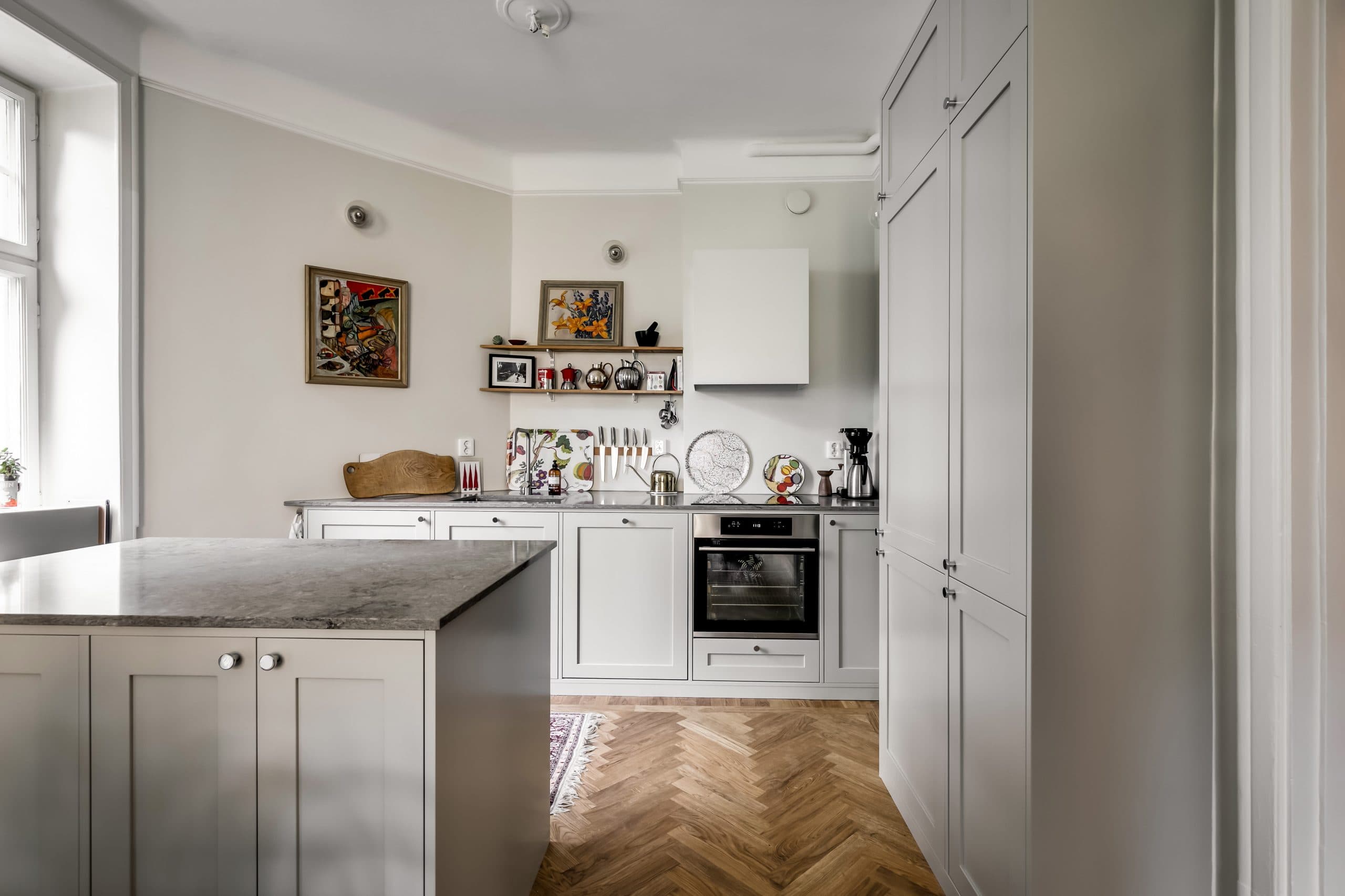 Här presenteras ett vackert ramkök med luckan Frame 70 i färgen Off Grey (2502-Y) som ger ett mjukt och ljust intryck. De inramade distanslisterna mellan, över och under stommarna förstärker kökets klassiska karaktär och bidrar till en ren och tydlig design. Det är detaljerna som gör skillnad – Key-knopparna ger en enkel men gedigen finish som kompletterar den ljusgrå färgen och ramen på ett fint sätt.