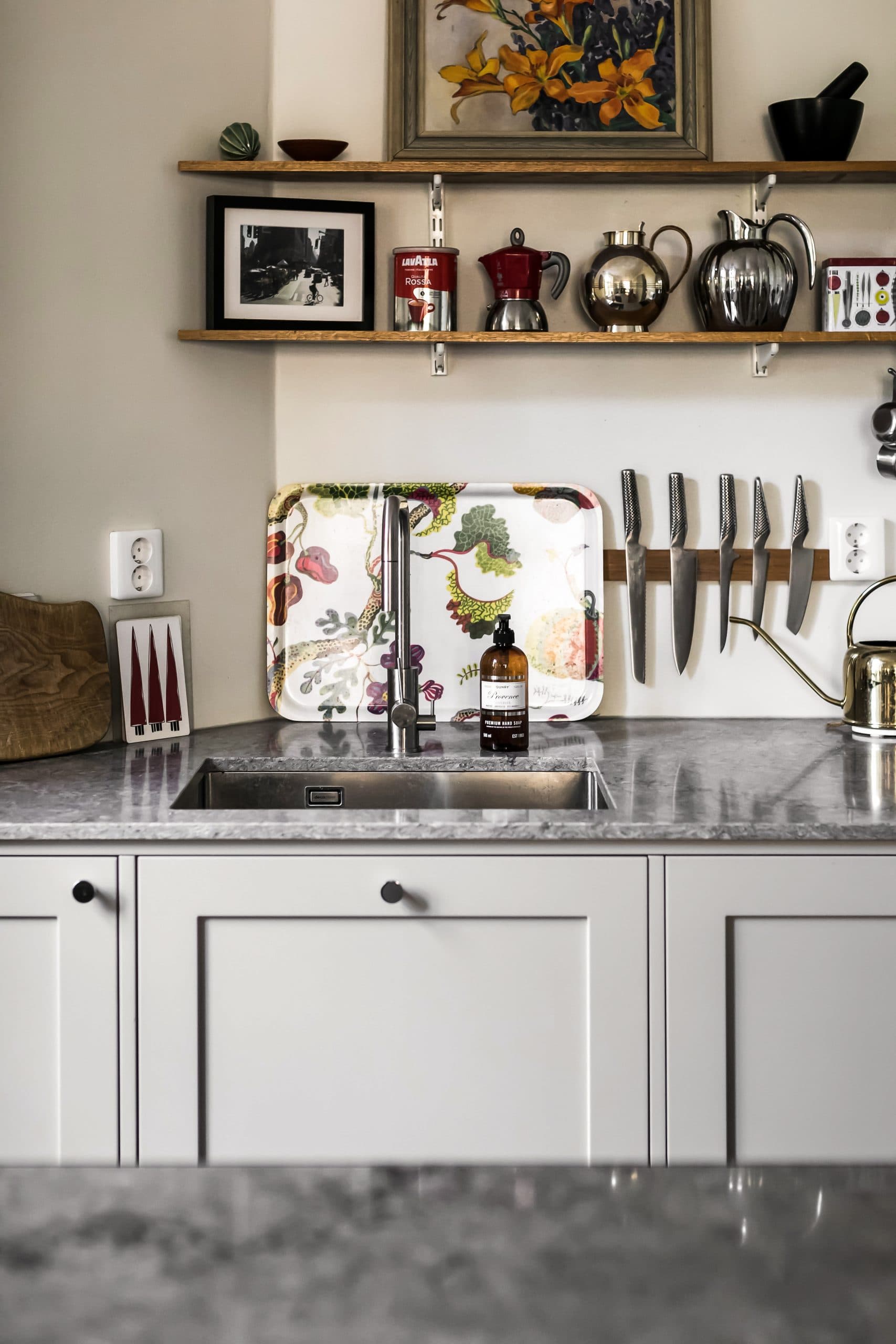 En av kökets starkaste designelement är den 20 mm tjocka, polerade bänkskivan Turbine Grey från Caesarstone. Den mörka och marmorerade ytan bryter av mot de ljusa luckorna och skapar ett snyggt kontrastspel. Materialet är kvarts, vilket gör bänkskivan tålig, lätt att rengöra och motståndskraftig mot repor och fläckar – perfekt för både vardag och fest.