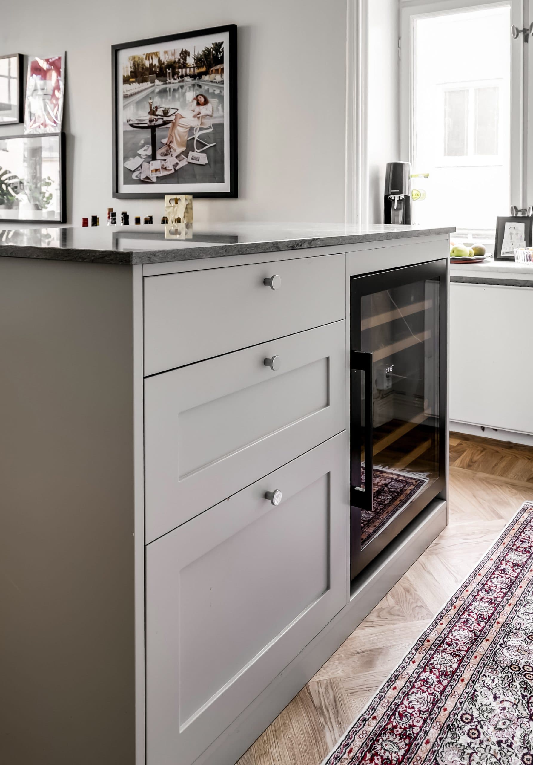 Köket är utrustat med en mindre köksö som fungerar som extra arbetsyta och förvaring. Köksön har även en inbyggd vinkyl, vilket gör den extra funktionell och skapar en naturlig samlingspunkt i köket. Denna lösning passar utmärkt i moderna hem där kök och vardagsrum ofta flyter ihop, och där en vinkyl gör det lätt att förvara och servera vin vid middagar och tillställningar.